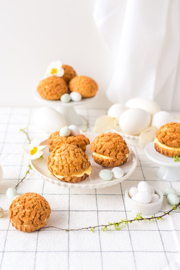 Auf Instagram habt ihr die kleinen österlichen Vorboten bereits gefeiert und wartet sehnsüchtig auf das Rezept. Hier kommt es nun also, aber wir müssen auch wirklich sagen, die kleinen Creamy Puffs oder wie sie die Franzosen nennen Choux au Craquelin sind auch wirklich der Hammer. Nicht nur optisch machen die kleinen Brandteiggebäckstücke ordentlich was her, wenn ihr einmal in die knusprige Kruste der Creamy Puffs gebissen habt, wollt ihr nichts anderes mehr und fragt euch wieso ihr nicht schon viel früher darauf gekommen seid, die Choux au Craquelin nachzubacken.