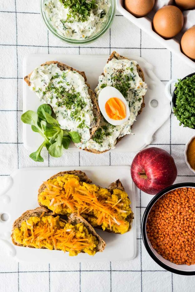 Ihr seht vielleicht schon unser Stullenduo auf den Bilder und bemerkt, dass es sich bei diesen beiden Varianten um zwei frühlingshafte Versionen handelt. Dürfen wir euch also vorstellen, heute gibt es eine Stulle mit Feldsalat-Bärlauch-Aufstrich, Ei und Frischkäse und einen Curry-Linsen-Aufstrich.