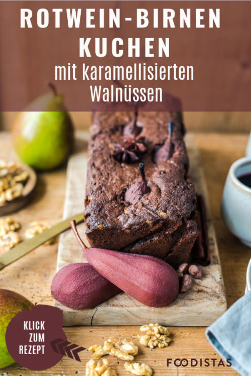 Lasst uns doch endlich mal wieder zusammen backen! Und weil wir es wie unsere Freunde von 1000 gute Gründe Obst und Gemüse lieben saisonale Produkte zu verwenden, widmen wir uns heute der Birne. Und da fangen wir doch direkt mal mit einer Frage an, die wohl viele Gemüter beschäftigt. Sollte diese zum Verzehr lieber schön knackig oder lieber weich sein? Ich bin auf jeden Fall der Meinung, dass so eine Birne richtig fest sein sollte, so mag ich sie am liebsten und so benötigt ihr sie auch für unseren Kastenkuchen. Hierfür wird die Birne ganz Foodistas like in Rotwein pochiert. Dies ist einfach eine sehr schonende Art der Zubereitung. Ihr mischt euch einen Sud aus Rotwein, Wasser, Zitrone, Sternanis, Zimt und Kardamom. Beim schreiben dieser Zeilen fällt mir auf, dies könnte auch ein Rezept für einen köstlichen Glühwein sein! Aber es eignet sich eben auch hervorragend für die Birnen! Der Sud wird aufgekocht und anschließend kommen die geschälten Birnen dazu, und das Aroma nach dem pochieren ist wirklich fein!