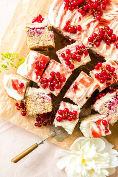 Unser marmorierter Johannisbeer-Blechkuchen mit Frischkäsefrosting ist echter Hingucker und dabei herrlich unkompliziert. Der saftige Teig mit Kokosöl, Joghurt und zwei Mehlsorten wird durch die leicht säuerlichen Johannisbeeren perfekt ergänzt. Das cremige Frosting aus Frischkäse, weißer Schokolade und einem Hauch Johannisbeermarmelade rundet den Kuchen aromatisch ab und macht ihn besonders saftig.