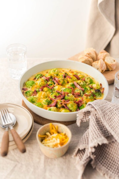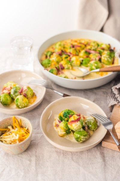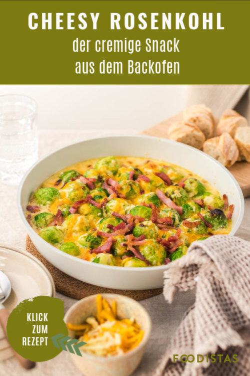 Und wenn ich euch jetzt verrate, welch leckere Zutaten sich in diesem Ofengericht verstecken, dann wollt ihr es hoffentlich auch cheesy! Der Rosenkohl wird hierfür kurz blanchiert und kommt dann zusammen mit Cheddar, Bergkäse, Crème fraîche, Baconstreifen und einer Schalotte in den Backofen. Ein richtig schnelles Rezept für die Feierabendküche und Soulfood pur!