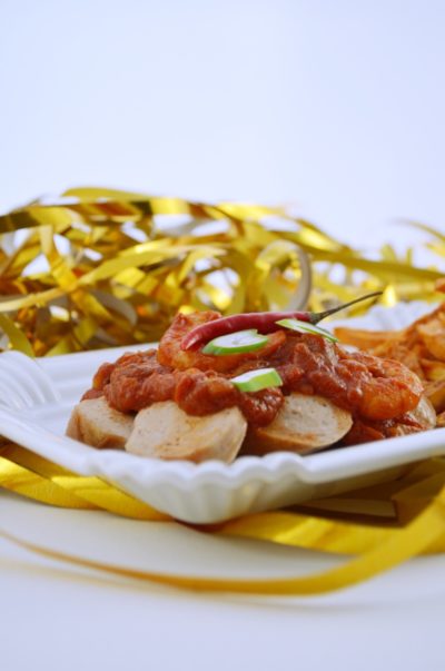 Zu Silvester darf es doch ruhig auch ein bisschen dekadent sein oder? Also warum nicht einmal eine Currywurst zusammen mit Garnelen. Wir finden diese Kombination einfach unwiderstehlich, denn die fruchtig scharfe Currysauce mit einem Hauch von Chili passt perfekt zu einer mildem Bratwurst und den Garnelen. Die Currywurst an sich ist reine Geschmackssache, wir haben uns für eine klassische Bratwurst entschieden. Durch die Zubereitung auf dem Grill bekommt sie die passenden Röstaromen und macht das Gericht zu einer runden Sache.