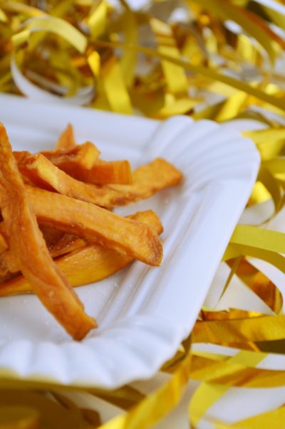 - Die Süßkartoffel-Pommes mit Meersalz würzen und servieren.