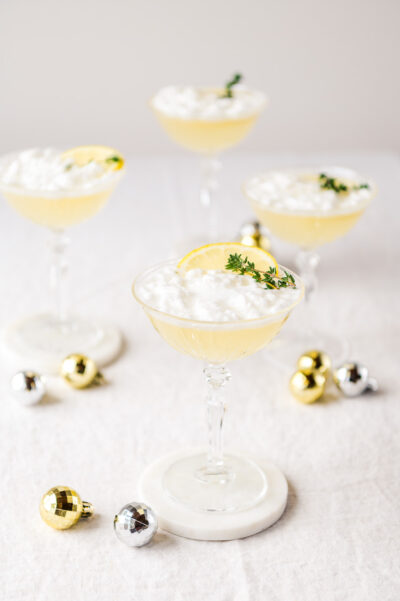 Viele Zutaten braucht ihr für diesen Silvester Drink nicht, Zitrone, Zuckersirup, Gin und etwas Eiweiß, dazu noch ein Hauch von Thymian und aufgegossen wir der Foamy Lemon Prosecco dann ganz standesgemäß mit Prosecco. Wer es so richtig krachen lassen will der gießt den Drink mit dem besten Champagner auf, denn wenn es auch für euch ein tolles Jahr war, lohnt es sich doch mal die Korken knallen zu lassen. Oder was meint ihr?