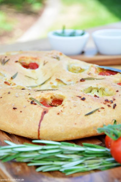 Also nun zur Praxis! Die Zubereitung ist wirklich einfach und man kann den Teig auch klasse am Vortag vorbereiten. Einfach alle Zutaten in eine Schüssel geben, gut verkneten und den Hefeteig über Nacht in den Kühlschrank gehen lassen. Am nächsten Tag den Teig einfach aus dem Kühlschrank nehmen und weiter verarbeiten. Die Fougasse kann man nach Herzenslust belegen. Mit Oliven, Peperoni, Artischocken oder getrockneten Tomaten. Es gibt viele verschieden Möglichkeiten, die man mit Kräutern wie Rosmarin und Thymian oder aber auch mit Knoblauch noch herrlich würzen kann. Uns hat der Belag mit Tomaten, Artischocken, Knoblauch und Rosmarin hervorragend geschmeckt. Aber wir werden bestimmt auch noch andere Varianten ausprobieren.