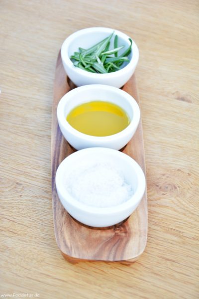 - Knoblauchzehen abziehen und pressen. Mit Olivenöl und Rosmarinblättern vermischen.
