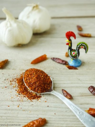 Perfekt werden die Granelen aber erst durch ein paar kleine Helferlein. Olivenöl, Knoblauch und Piri-Piri. Piri-Piri ist eine besondere Chiliart, die getrocknet und geschrotet wird. Sie hat den Schärfegrad 8 und ist dadurch mit Fingerspitzengefühl zu nutzen. Aber es gehören auch noch etwas Brot, Oliven und portugiesischer Wein dazu, denn Fisch muss ja bekanntlich schwimmen. Als wir (Tanja, Tine und ich) im letzten Jahr zusammen in Portugal waren, haben wir Unmengen an Garnelen schwimmen lassen. Das Baguette für meine Garnelen Piri-Piri habe ich selber gebacken und mich eines bewerten Rezeptes bedient. Das Rezept für das super einfache und leckere Baguette hatten wir euch ja bereits bei unserer Ziegenkäse Terrine präsentiert.