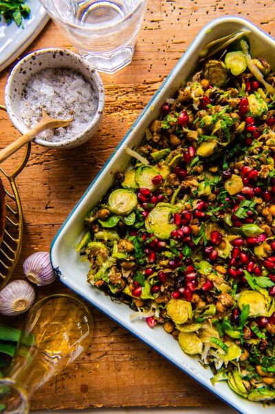 Das Herzstück dieses Gerichts ist jedoch das Sardellen-Tahini-Dressing. Die Sardellen ersetzen Salz und geben eine würzige Tiefe, die perfekt mit dem Zitronensaft, Tahini und Knoblauch harmoniert. Gemeinsam mit frischer Petersilie wird daraus ein cremiges Dressing, das sich wunderbar um den warmen Rosenkohl legt – intensiv, aromatisch und absolut süchtig machend. Gekrönt wird dieses Gericht dann noch von fruchtigen Granatapfelkernen und geriebenem Parmesan.