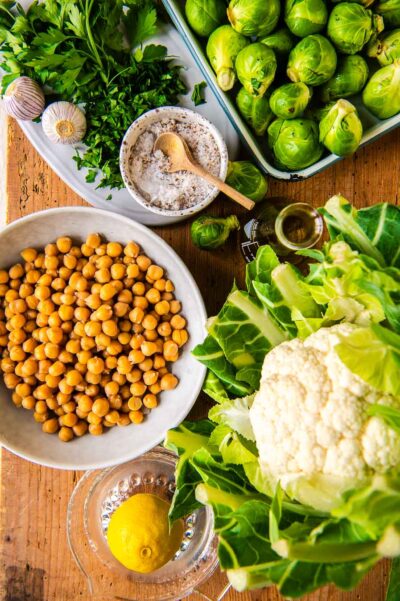 Gerösteter Rosenkohl mit Kichererbsen Crumble und Blumenkohl Tarte