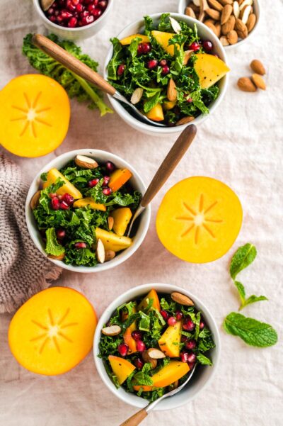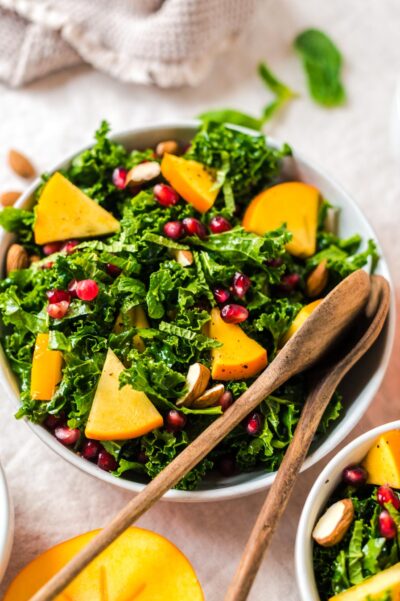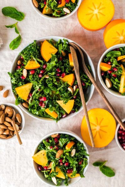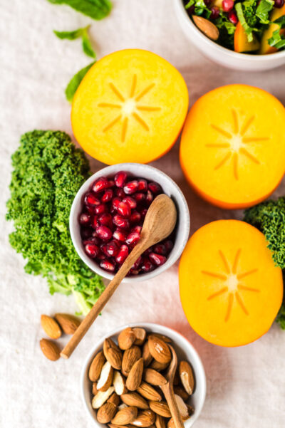 Grünkohlsalat mit Kaki, Mandeln und Granatapfelkernen