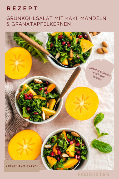 Heute kommen wir mit einem winterlichen und vor allem gesunden Salat um die Ecke. Einer Vitaminbombe in der Salatschüssel quasi, denn all unsere farbenfrohen Zutaten sind wahre Energie- und Vitaminlieferanten und bringen euch gesund über den anstehenden Winter! Unser Grünkohlsalat mit Kaki, Mandeln und Granatapfelkernen wird euch begeistern, da sind wir uns alle vier sicher!