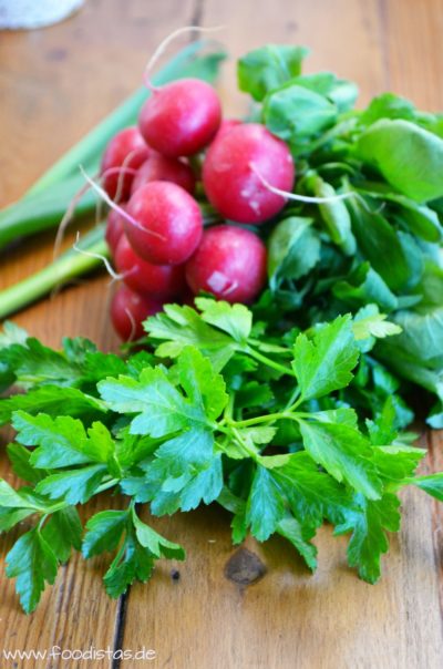 - Die Frühlingszwiebeln waschen, Wurzelansätze entfernen und in feine Ringe schneiden. Die Radieschen waschen und in kleine Würfel schneiden. Die Petersilie waschen und fein haken.