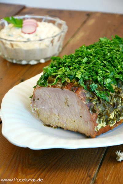 Für unseren Brunch habe ich einen Kasseler-Braten mit einer Kräuter-Senf-Kruste zubereitet. Der Kasseler wird mit einem Mantel aus Senf und Frühlingszwiebel im Bratenschlauch einfach in den Ofen geschoben und ist somit auch gut vorzubereiten. Geht schnell und schmeckt klasse! Zu dem Braten habe ich noch eine Remoulade mit Frühlingszwiebeln, Radieschen und Petersilie zubereitet. Diese rundet das Gericht super ab.