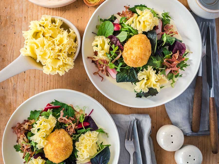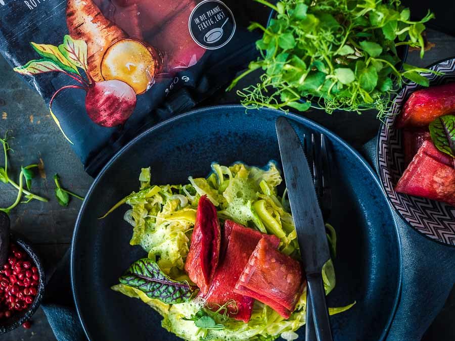 Und weil wir stolze Käsepaten sind, kommt hier auch schon das nächste Rezept für unser virtuelles Foodistas Ostermenü, wir servieren euch einen Birnen Walnuss Salat mit Chicorée und Tête de Moine AOP. Ein wunderschön fruchtiges Dressing passt hier hervorragend und wird von uns noch mit Apfelsaft verfeinert.