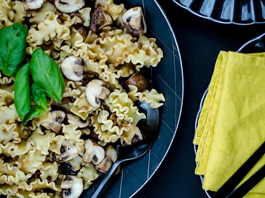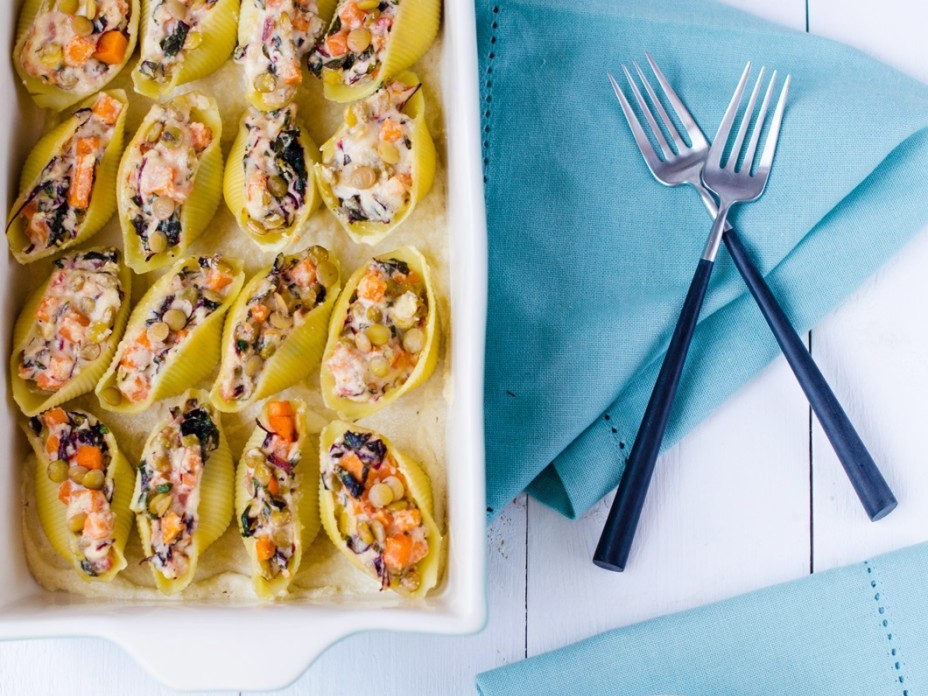 Gefüllte Muschelnudeln mit Linsen, Süßkartoffeln und Mangold