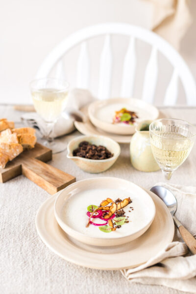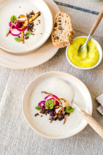 Auf den Tisch kommt heute eine herzerwärmende Petersilienwurzelsuppe mit einem Topping aus frittierter Petersilienwurzel, Schwarzbrot-Crumble und eingelegten roten Zwiebeln. Diese Suppe macht süchtig, denn hier vermisst ihr einfach gar nichts. Die cremige, leicht würzige Suppe gepaart mit dem kräftigen Geschmack des Schwarzbrot-Crumbles sind schon unschlagbar. Da wir aber nichts von der Petersilienwurzel vergeuden wollen, verwenden wir sogar die gewaschene Schale und frittieren sie kurzerhand. Als weiteres Topping dienen in Rote Bete Saft und Essig eingelegte rote Zwiebeln. Diese könnt ihr super vielseitig und eben nicht nur zur Suppe verwenden. Sie eignen sich ebenfalls für ein deftiges Abendbrot als Garnitur auf der Frischkäsestulle oder einem Stück kurzgebratenem Fleisch. Das herrlich süß-saure Aroma rundet unsere Suppenkreation einfach perfekt ab!