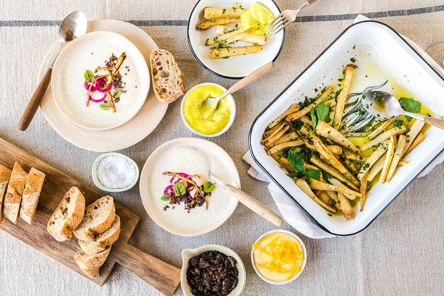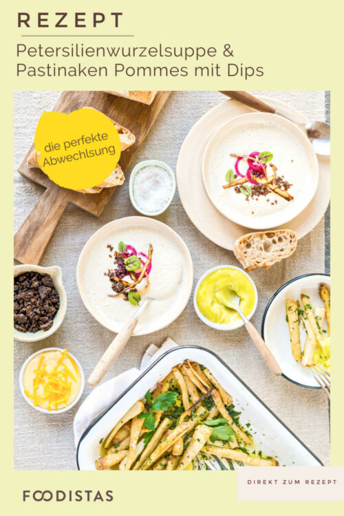 Petersilienwurzelsuppe & Pastinaken Pommes mit zweierlei Dips