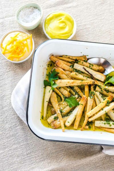 Aber nicht genug, vielleicht habt ihr auf den Bildern schon entdeckt, dass es eine weitere Köstlichkeit, allerdings mit der Pastinake gibt. Wir servieren weiterhin knusprige im Ofen gegarte Pastinaken Pommes mit zweierlei Dips. Hier verwenden wir, bis auf den holzigen Strunk auch das komplette Wurzelgemüse. Und was darf zu Pommes auf keinen Fall fehlen, genau, mindestens eine Mayonnaise, in unserem Fall eine feurig scharf Wasabimayonnaise und ein cremiger Chili-Cheese-Dip mit Cheddar Käse!
