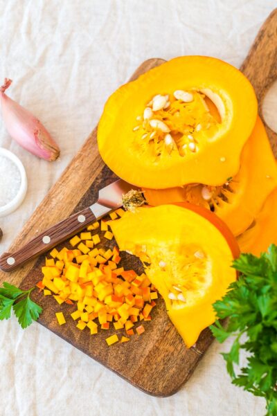 - Drei der Kürbisscheiben in kleine Würfen schneiden.