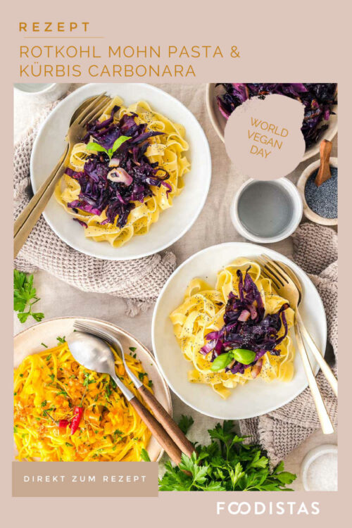Und was mag jeder? Ja genau, Pasta und darum gibt es diese euch ganz vegan in zwei Versionen. Eine Carbonara Variante mit Kürbis, die dem Klassiker ins nichts nachsteht und eine Kombination aus Rotkohl, Mohn und Fettuccini, die außergewöhnlich klingen mag, aber dafür umso köstlicher und überraschender ist.