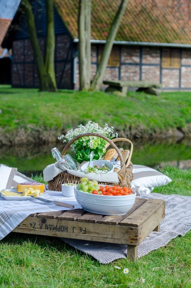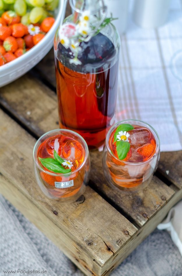 Was darf bei einem perfekten Picknick in keinem Fall fehlen? Richtig, ein Getränk, entweder in Form eines Saftes, eines Kaltgetränkes mit einem Hauch Alkohol oder auch einfach mal einer Limonade. Und genau für die habe ich mich bei einem unserer Picknicks entschieden. Es muss ja schließlich auch mal einfach sein für so ein Picknick, aber trotzdem mit der gewissen Raffinesse. Und da kommt dann auch wieder meine Erdbeerlimo mit Basilikum ins Spiel. Sie macht nicht nur farblich allerhand her, sondern ist auch geschmacklich einfach passend zu einem Picknick.