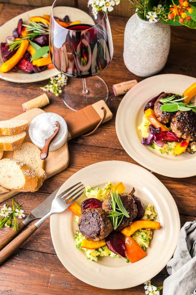 Dazu gibt es ein cremiges Kürbispüree und Rotweinzwiebeln. Die Rotweinzwiebeln werden übrigens mit einem feinen Bordeaux Wein eingeköchelt, dieser macht sich aber auch wunderbar im Glas.