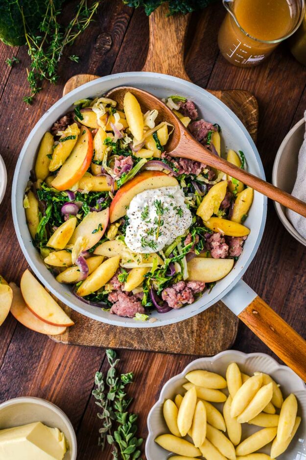 Wirsing-Apfel-Pfanne mit Salsiccia und Weißkohl-Kartoffel-Strudel