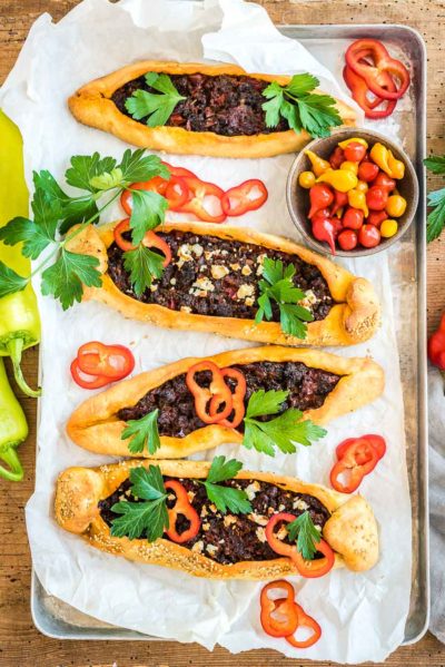 - Die Pide vorsichtig auf zwei mit Backpapier ausgelegte Backbleche legen und mit dem Olivenöl bestreichen. Den schwarzen Sesam oder Schwarzkümmel darauf verteilen und für 20 Minuten backen.