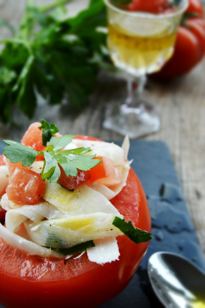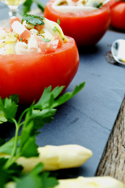 - Alle Zutaten zu einem Salat vermischen und dann in die ausgehüllten Tomatenschalen füllen.