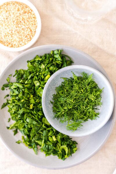 - Den Spinat und Dill waschen, trocken und grob zupfen. Den Knoblauch häuten.