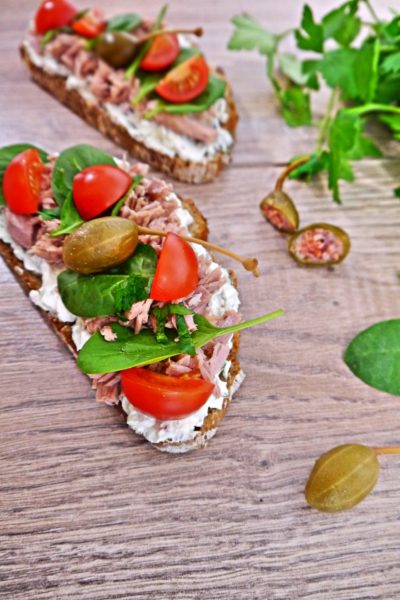 Tine und ich essen unheimlich gerne Thunfisch und Kapernäpfel. Also haben wir zusammen mal eine Stullenvariante mit Thunfisch, Tomaten, Spinat und Kapernfrischkäse zubereitet. Der Geschmack von Kapernäpfeln ist sehr intensiv und aromatisch, meist kennt man sie einfach als Antipasti. Wir haben sie unter Frischkäse gemischt und als Brotaufstrich verwendet. Uns hat diese Frischkäsecreme mit Kapernäpfeln und Petersilie in Kombination mit Thunfisch, Spinat und Tomaten wirklich gut gefallen und wir haben diese Stullen Variante schon oft zusammen verspeist!
