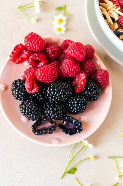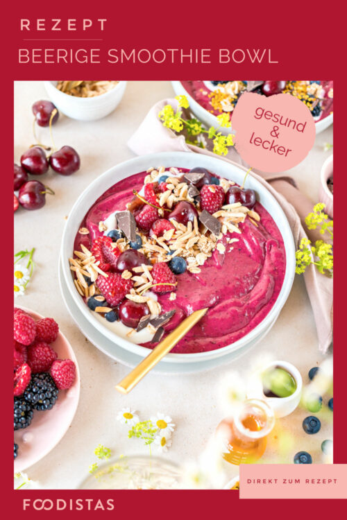 Den Anfang macht unsere beerige Frühstücksbowl! Hier kommt alles rein was ihr in den Finger bekommt und aktuell Saison hat. Wie wäre es zum Beispiel mit Himbeeren, Blaubeeren, Kirschen und Brombeeren. Die ersten Johannisbeeren dürfen gerne auch auf und in die Bowl. Ein kleiner Tipp von uns, um so eine Smoothie Bowl schön cremig zu bekommen, friert einfach ein paar überreife Bananen ein, in Kombination mit tiefgefrorenen Himbeeren, Joghurt und Mandelmus ist dies nämlich eine unschlagbare Kombination.