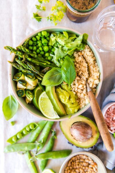 Ganz intuitiv und durch Zufall ist unsere herzhafte Bowl ein Traum in grün und rein vegetarisch geworden! Das Großartige an dieser Variante ist, ihr könnt alles hierfür super vorbereiten. Also eignet sich diese Bowl auch super, für den gesunden Snack im Büro. Den Couscous kann man an Tag vorher kochen, genauso, die Zucchini, Erbsen und den Spargel. Da wir doch glatt das Ende der Spargelsaison verpasst haben, versäumen wir es natürlich nicht, euch passende Alternativen für diese grüne Bowl zu nennen. Wie wäre es zum Beispiel mit Blumenkohl oder Brokkoli, aber auch Fenchel oder Kohlrabi eignen sich wunderbar für die Zubereitung in einer Bowl.