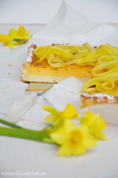 Und das absolute Geschmackserlebnis befindet sich dann in der Creme. Irgendwie hatte ich mir in den Kopf gesetzt, Süßkartoffel in meinem Kuchen zu verarbeiten. Und ich muss euch sagen, ich bereue es auf keinen Fall. In Kombination mit der Mango hatte die Creme eine Konsistenz wie die Creme eines Käsekuchens. Und durch die frische Mango auf der Tarte hat sie absolut frühlingsfrisch und fruchtig geschmeckt — eine echte Vitaminbombe. Da ich Tanja an dem Wochenende besucht hatte, brachte ich die Tarte einfach mit und im Nu hatten wir diese köstlich quadratische Tarte verputzt. Ich kann euch nur empfehlen, probiert die Kombination ruhig einmal aus ihr werdet begeistert sein.