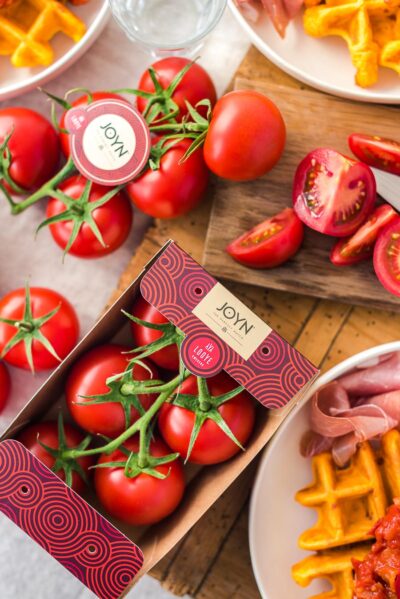 Die JOYN® Tomaten von Looye sind einfach super aromatisch und gehören für uns zu den leckersten Tomaten, die wir bis jetzt probiert haben. Die Rispentomaten sind mit ihrer festen Struktur und einer wunderbaren Balance zwischen Süße und Säure nämlich nicht nur pur ein Genuss, sondern sie verfeinern in unserem Fall mit ihrem Saft die Frühstückswaffeln und unser selbstgemachtes Sugo.