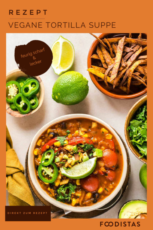 Also macht euch bereit für unsere vegane Tortilla Suppe, feurig scharf und voller gesunder Zutaten! Paprika, Linse, schwarze Bohnen, ordentlich Knoblauch und Koriander, dazu Kokosmilch, Tomaten und viel Chili! Dazu gibt es knusprige Tortillastreifen und cremige Avocado! Diese Suppe lässt einfach nichts vermissen und ist innerhalb von 30 Minuten auf eurem Teller! Ebenfalls perfekt eignet sich die Suppe auch zum Meal Prep, denn man kann sie wunderbar einfrieren und nach Bedarf auftauen! Oft empfehlen wir euch unsere Rezepte zu variieren oder Zutaten auszutuschen, wenn noch etwas im Kühlschrank übriggeblieben ist, aber bei dieser Veganer Tortillasuppe können wir euch nur empfehlen, genau alle Zutaten genauso zu kombinieren, denn hier macht es tatsächlich die Mischung die wir uns für euch überlegt haben!