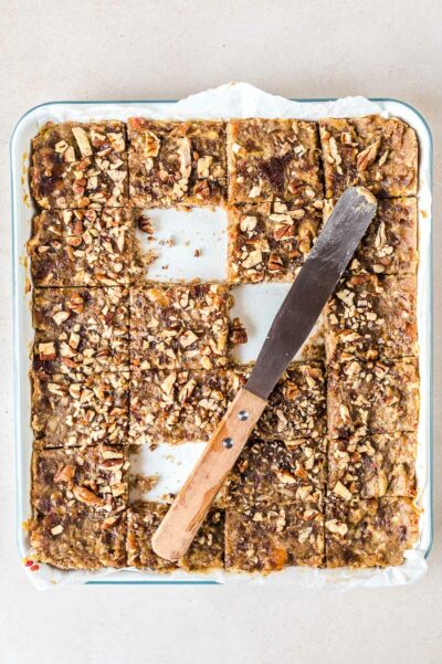 Es gibt vegane Pecan Pie Bars mit Äpfeln! Und hierfür müsst ihr nicht mal den Backofen anschmeißen. Sowohl für den Boden als auch das Topping werden einfach alle Zutaten in einem Mixer püriert, auf ein Blech gestrichen und dann im Kühlschrank kaltgestellt. Hier könnt ihr die Pecannüsse gerne auch durch Walnüsse austauschen, denn dies haben wir ebenfalls für richtig gut und lecker befunden! Der Apfel macht die kleinen Bars super saftig und fruchtig. Die Kombination aus Frucht und Nuss ist nämlich so einfach wie genial!