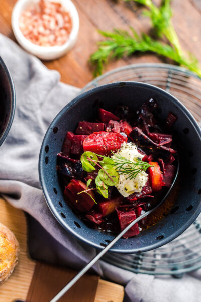 Aus diesem Grund möchten wir heute das Rezept für eines der bekanntesten ukrainischen Rezepte mit euch Teilen — Borschtsch! In unserem Fall ist unsere Version eine vegetarische Abwandlung. Ein richtiger Seelenwärmer und ich muss gestehen, ich habe diesen ukrainischen Klassiker lange außer Acht gelassen. Ein Fehler, denn die Kombination aus Roter Bete, Möhren, Rotkohl, Kartoffeln, Dill und Tomaten ist wirklich eine kleine Aromenbombe in Form es Eintopfs und ein Seelenwärmer zugleich!