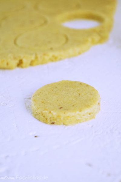 Nun den Teig auf einer bemehlten Arbeitsfläche ca. 1 cm dick ausrollen. Danach mit einem runden Ausstecher Kreise ausstechen.